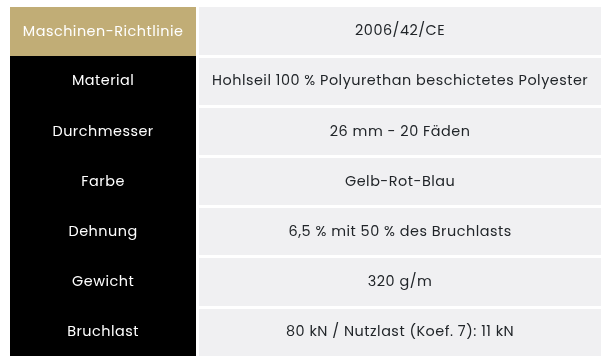 Gespleißte Augschlingen aus 26mm Polyester-Hohltau mit PU Beschichtung.